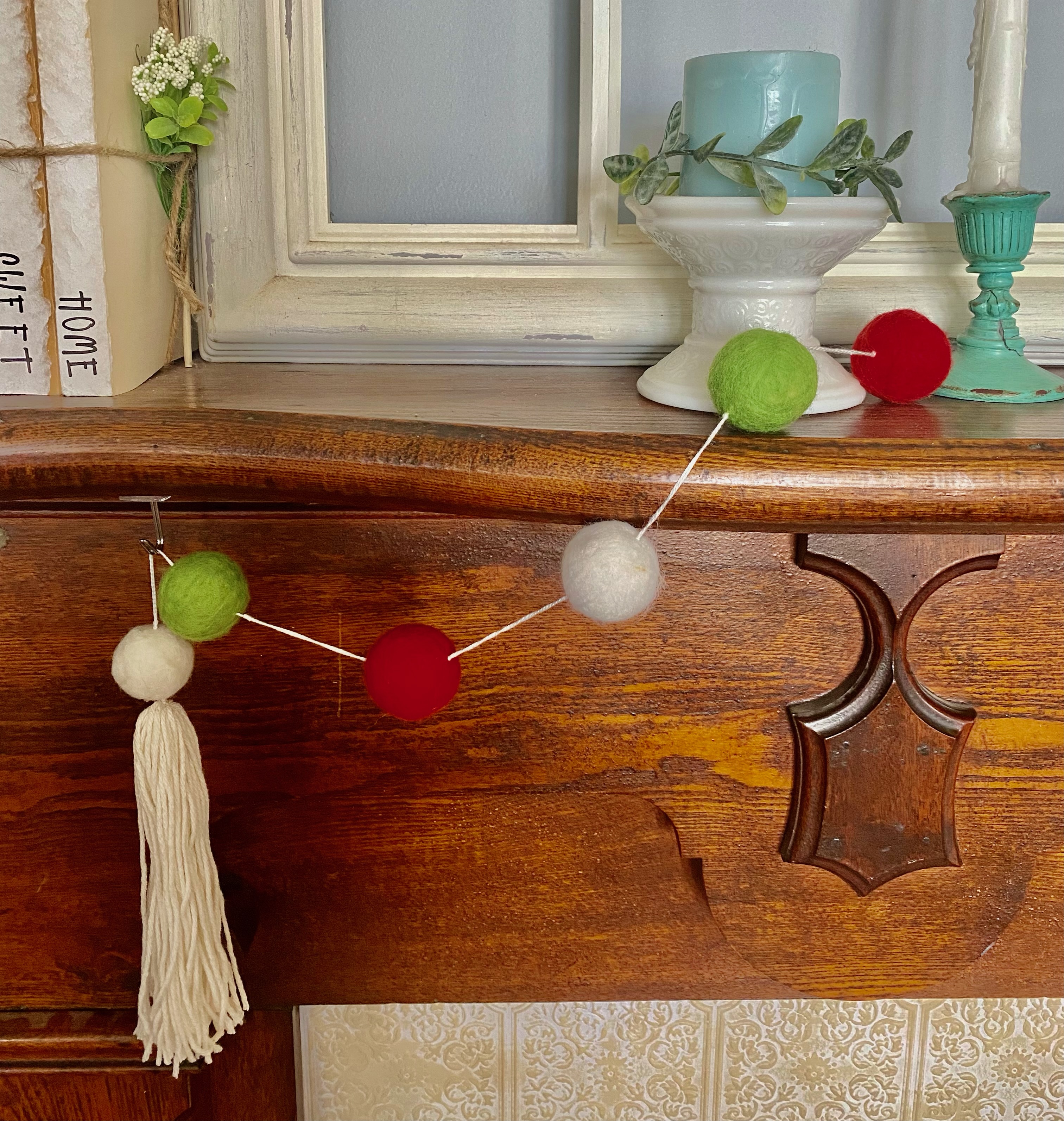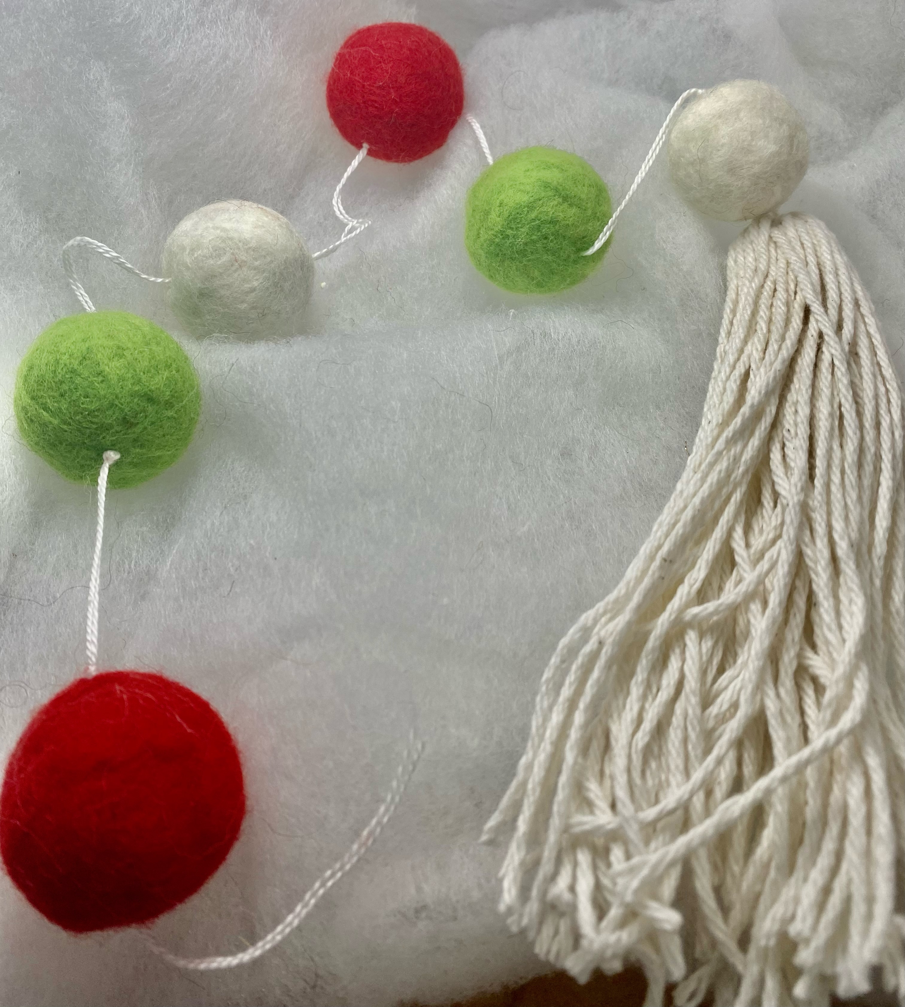 Christmas garland made from felted wool balls. Approximately 28 inches long. Garland tassel is long enough that you can cut it to a small length if you would like.